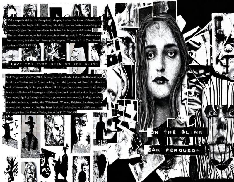 “Zak Ferguson’s On The Blink is (may be) a toothache-induced hallucination, a frantic meditation on self, on writing, on the passing of time. At times minimalist—nearly white pages flicker like images in a zoetrope—and at other times an effusion of language and ideas, the book evokes/invokes Joyce and Burroughs, tripping through the past, tripping over memories, spinning out tales of child-murderers, movies, the Whitehawk Woman, Brighton, brothers, and a remote cabin. Above all, On The Blink is about making sense of a life not lived in a straight line.” – Patrick Parks, Author of TUCUMCARI